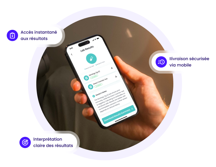 Recevez des tests de laboratoire et des services d'imagerie à domicile avec un prélèvement d'échantillons professionnel et des résultats précis livrés en toute sécurité via l'application.